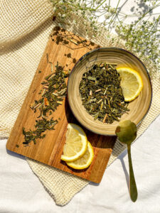 Ingrediënten: Groene thee China Sencha*, citroengras* (12%), natuurlijk citroen aroma, citroenschil* (3%). *Van gecertificeerd biologische teelt