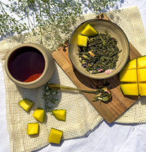 Ingrediënten: Groene thee China Sencha*, mango stukken*, natuurlik mango aroma, natuurlik sinaasappel aroma, rozenblaadies*, blauwe korenbloem*, gele goudsbloem* natuurlijk bergamot aroma. * Van gecertificeerd biologische teelt